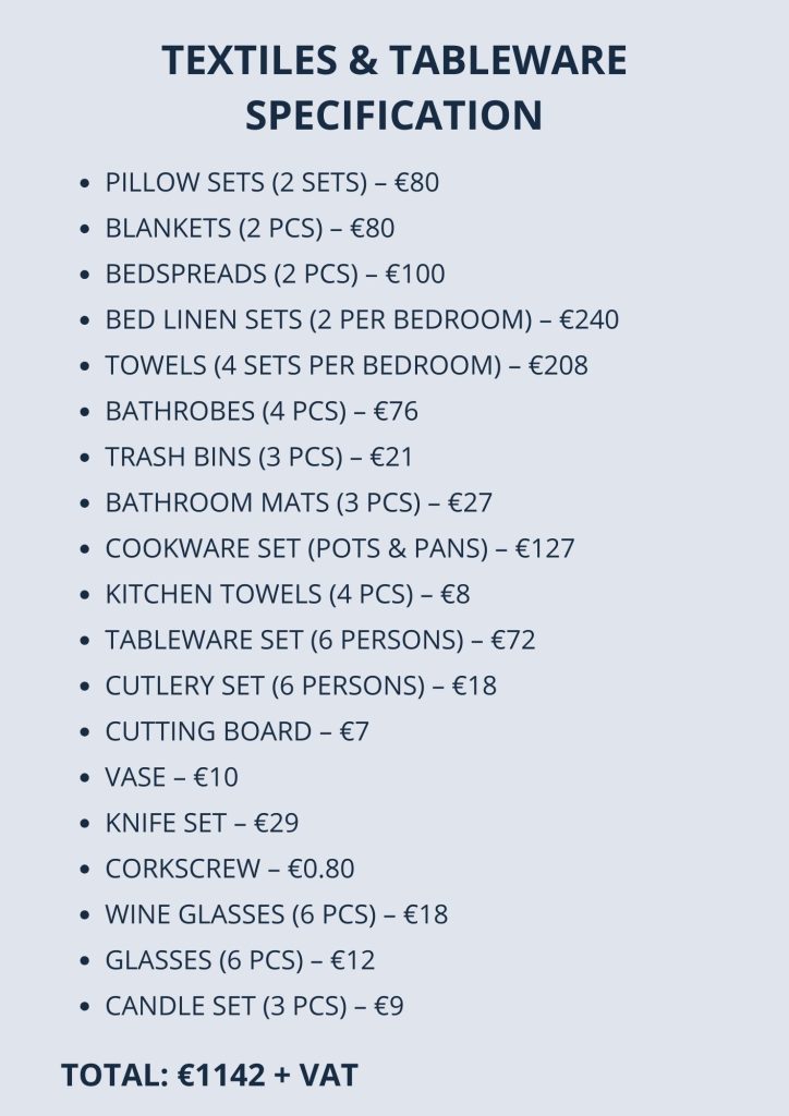 Проект меблировки 15 апартаментов на Кипре - полный комплект мебели, текстиля и посуды